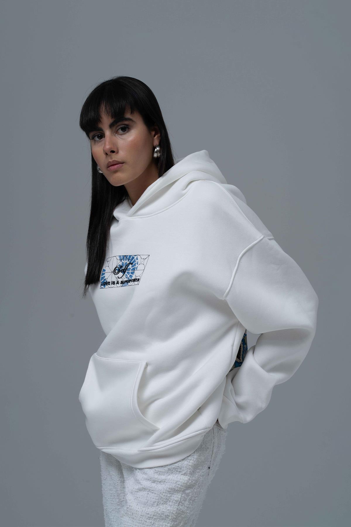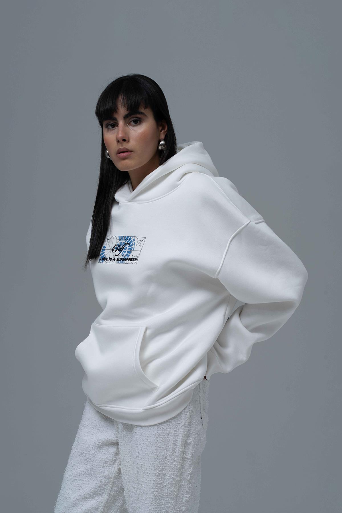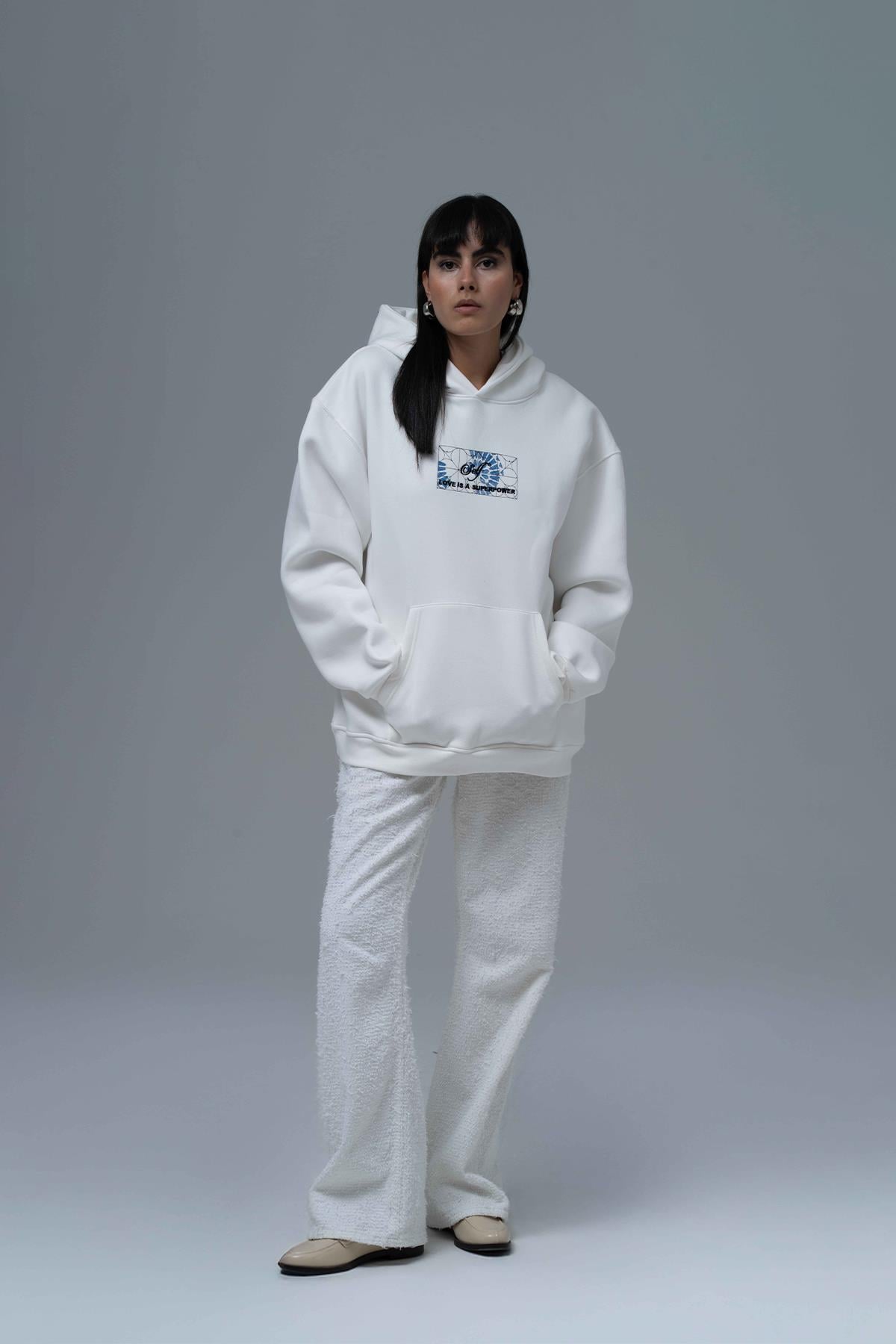 Şardonlu Üç İplik Kumaştan Üretilmiştir. Nakış & özel baskı detaylıdır. Kumaş İçeriği: %75 Pamuk %25 Polyester Kanguru cepli ve kapüşonlu oversize hoodie.