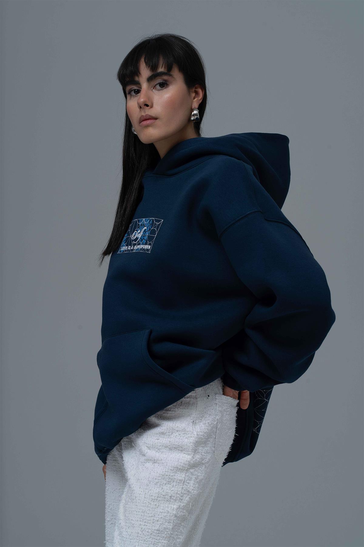 Şardonlu Üç İplik Kumaştan Üretilmiştir. Nakış & özel baskı detaylıdır. Kumaş İçeriği: %75 Pamuk %25 Polyester Kanguru cepli ve kapüşonlu oversize hoodie.