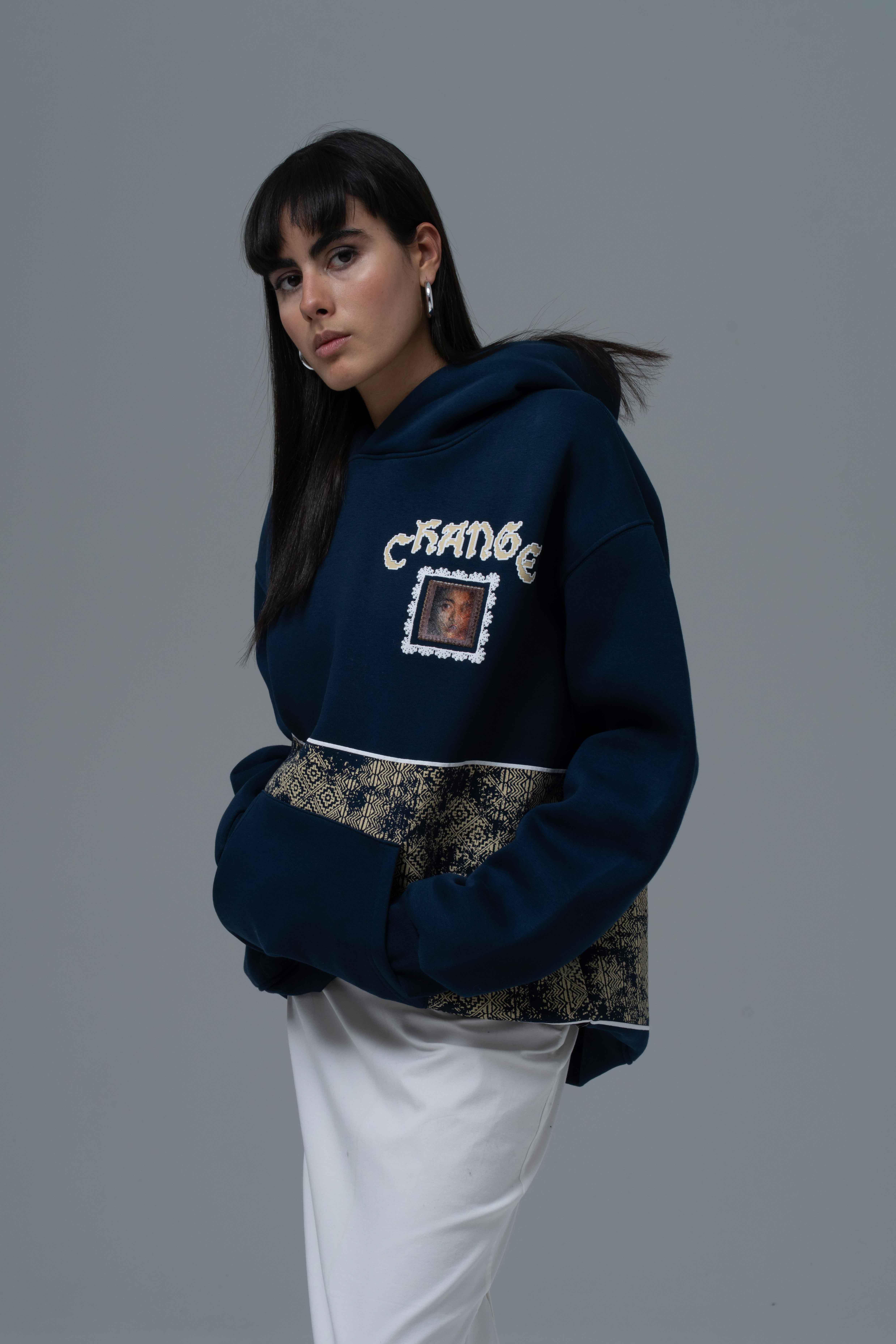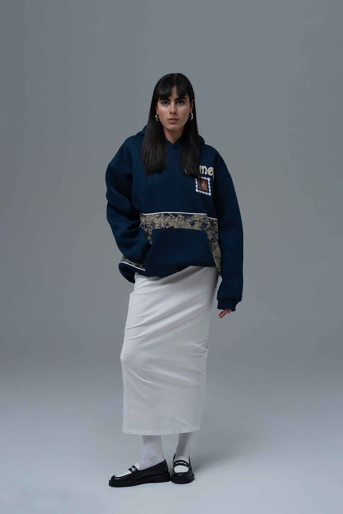 Şardonlu Üç İplik Kumaştan Üretilmiştir. Nakış & Kadife Aplike,Özel Baskı Detaylıdır. Kumaş İçeriği: %75 Pamuk %25 Polyester Kanguru cepli ve kapüşonlu oversize hoodie.