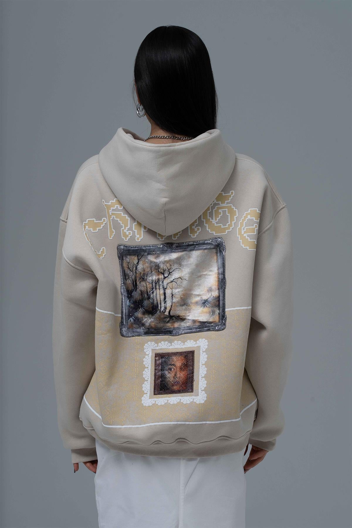 Şardonlu Üç İplik Kumaştan Üretilmiştir. Nakış & Kadife Aplike,Özel Baskı Detaylıdır. Kumaş İçeriği: %75 Pamuk %25 Polyester Kanguru cepli ve kapüşonlu oversize hoodie.