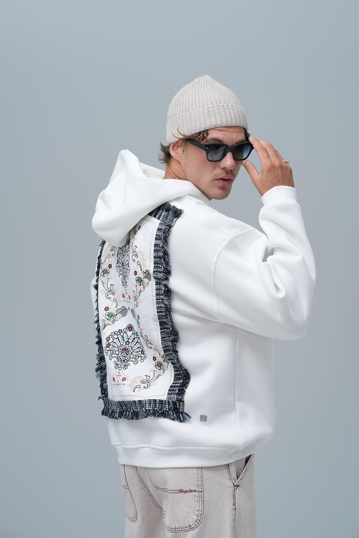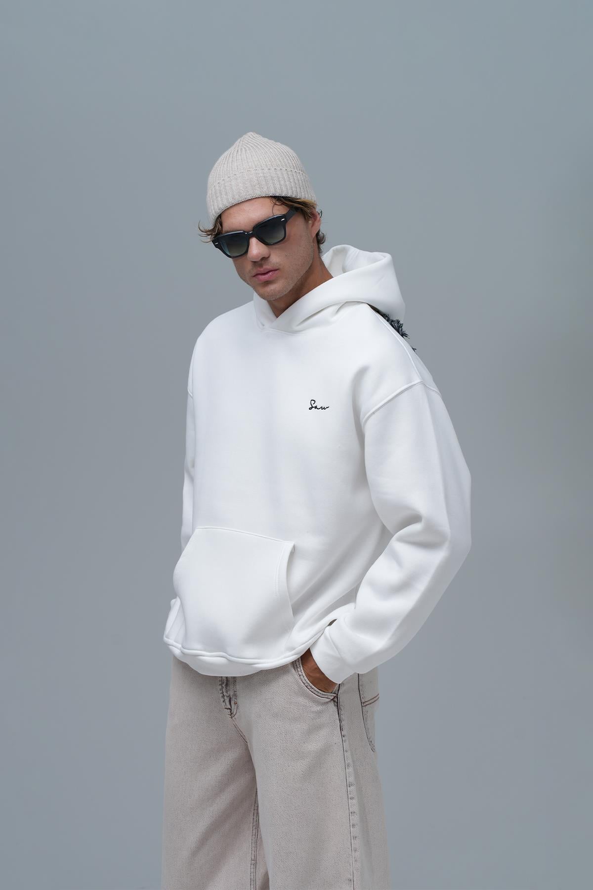Model 191 cm boyunda ve 83 kg ağırlıpında olup XL beden giymektedir. Şardonlu Üç İplik Kumaştan Üretilmiştir. Nakış & Kadife Aplike Detaylıdır. Kumaş İçeriği: %75 Pamuk %25 Polyester Kanguru cepli ve kapüşonlu oversize hoodie.