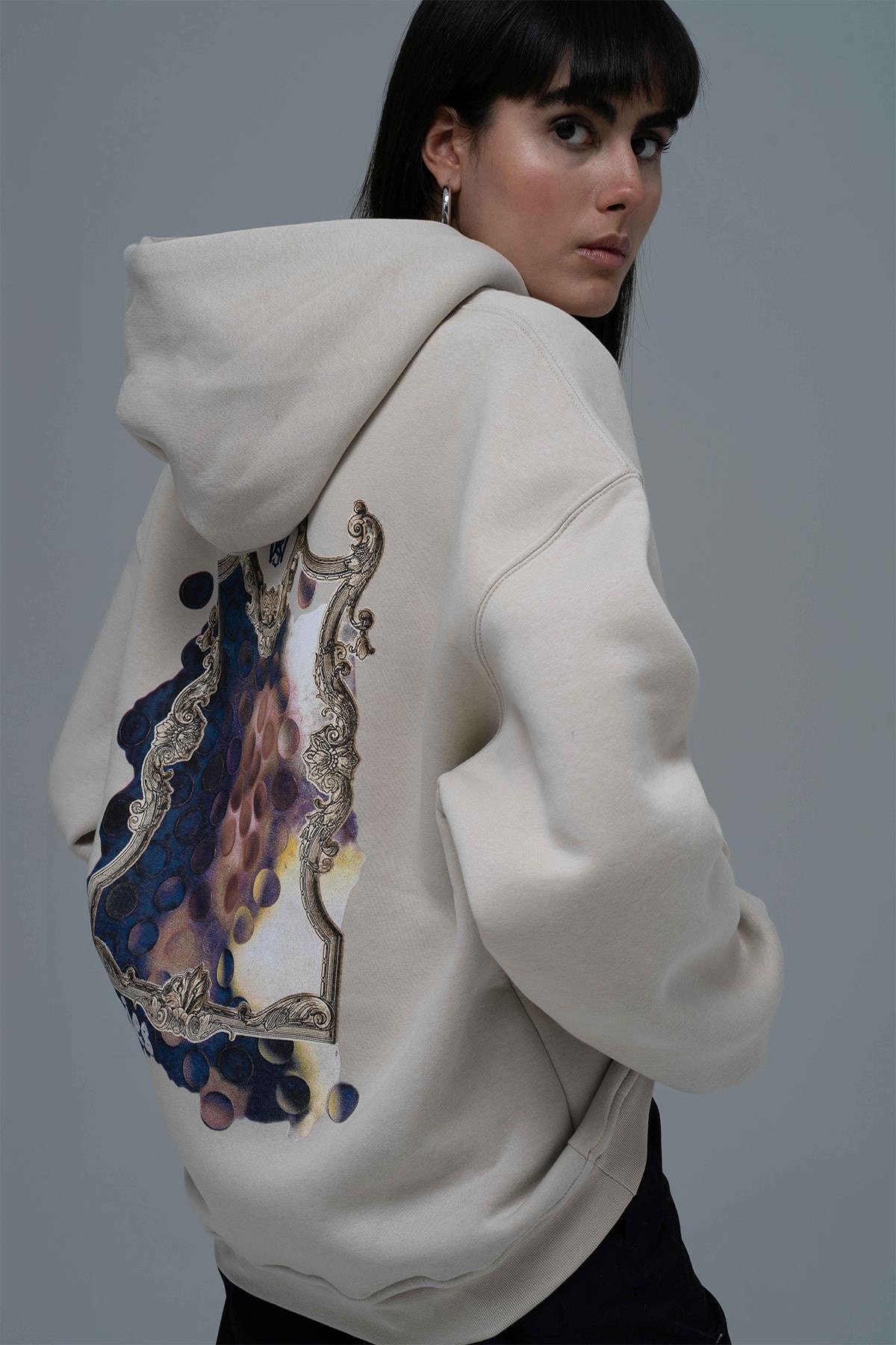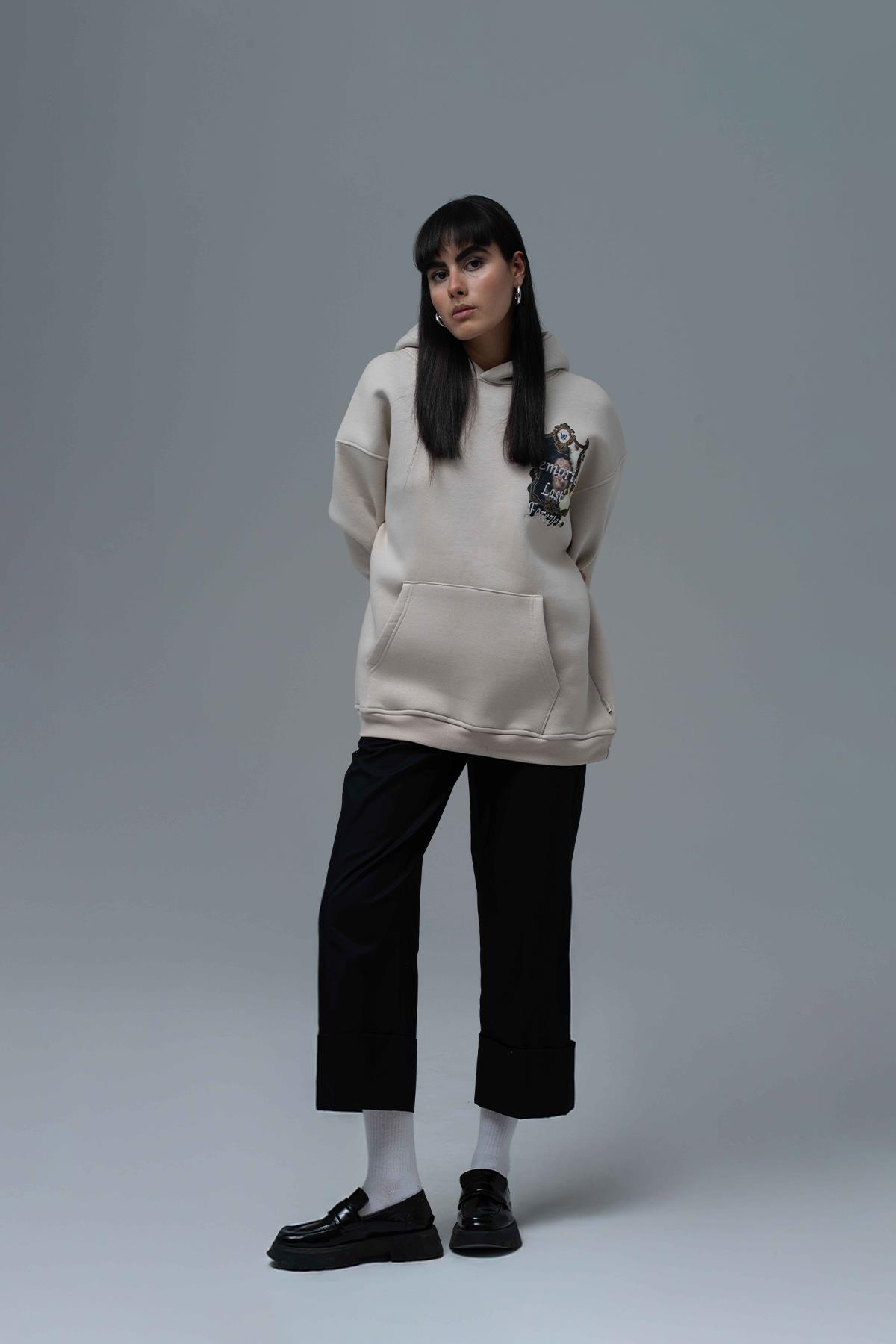 Şardonlu Üç İplik Kumaştan Üretilmiştir. Özel Baskı Detaylıdır. Kumaş İçeriği: %75 Pamuk %25 Polyester Kanguru cepli ve kapüşonlu oversize hoodie.