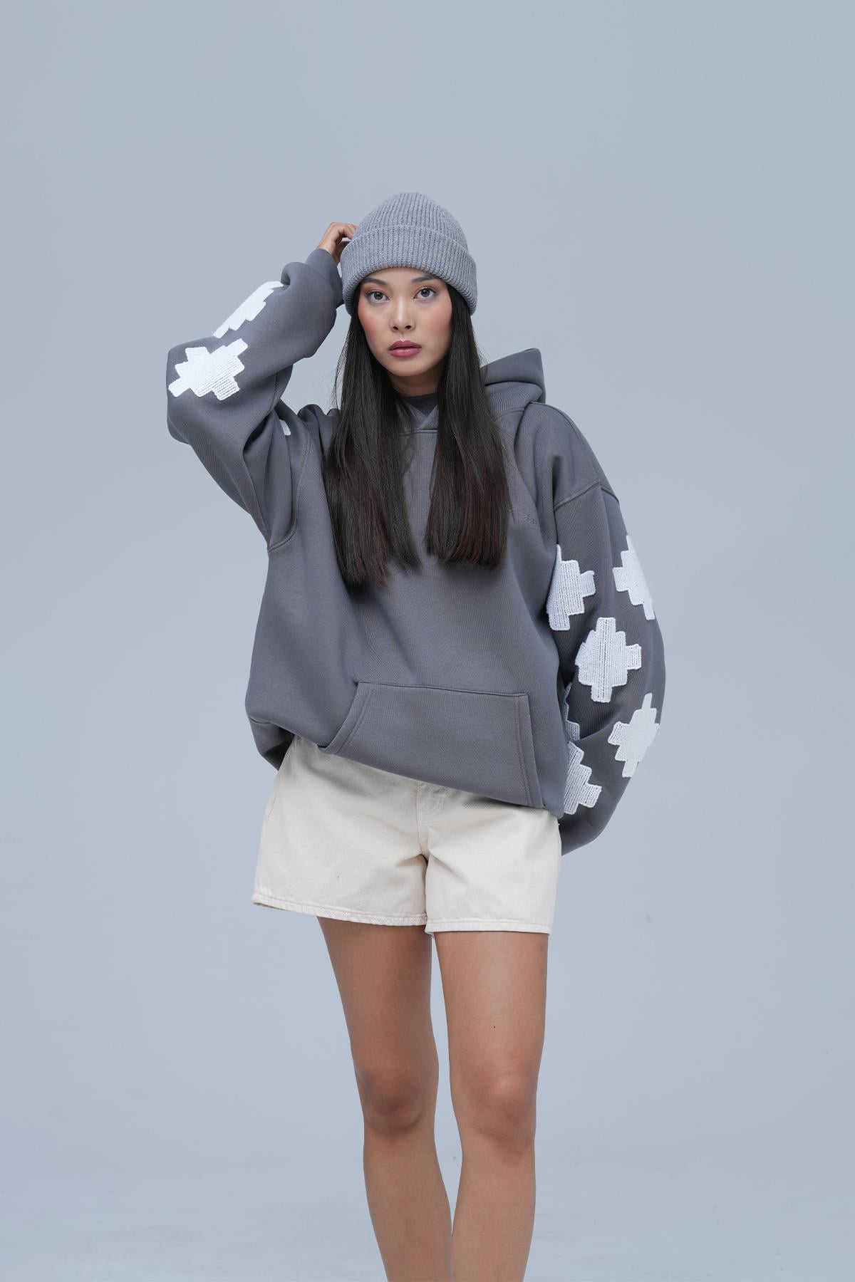 Şardonlu Üç İplik Kumaştan Üretilmiştir. Nakış Detaylıdır. Kanguru cepli oversize kalıp kapüşonlu hoodie. Kumaş İçeriği: %75 Pamuk %25 Polyester