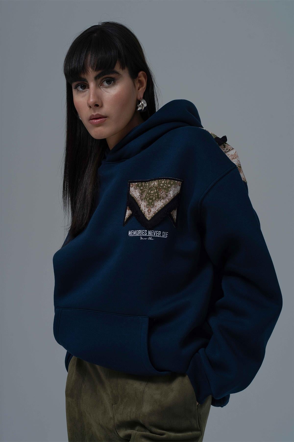 Şal formunda aplikeli,püskül detaylıdır. Şardonlu Üç İplik Kumaştan Üretilmiştir. Nakış & Özel Baskı Detaylıdır. Kumaş İçeriği: %75 Pamuk %25 Polyester Kanguru cepli ve kapüşonlu oversize hoodie.