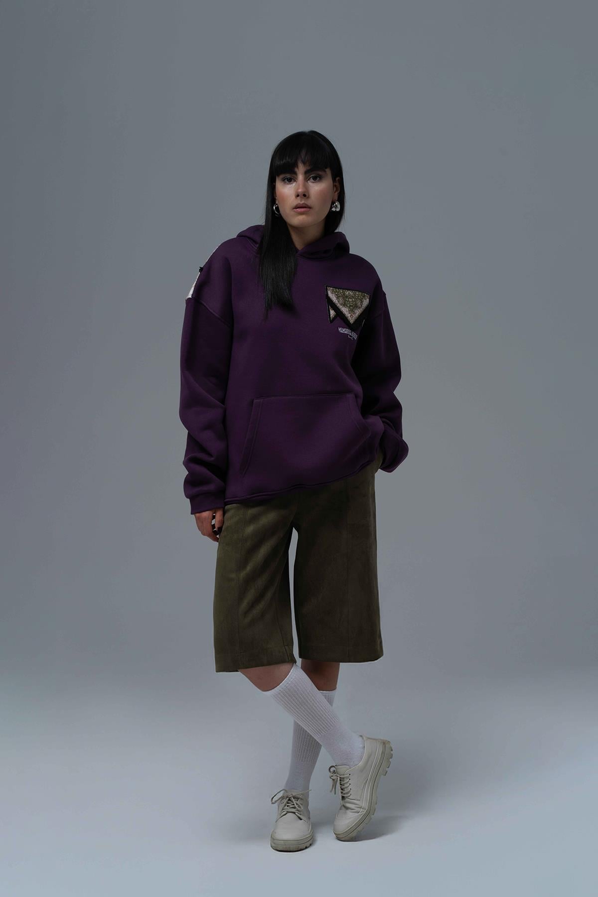 Şal formunda aplikeli,püskül detaylıdır. Şardonlu Üç İplik Kumaştan Üretilmiştir. Nakış & Özel Baskı Detaylıdır. Kumaş İçeriği: %75 Pamuk %25 Polyester Kanguru cepli ve kapüşonlu oversize hoodie.